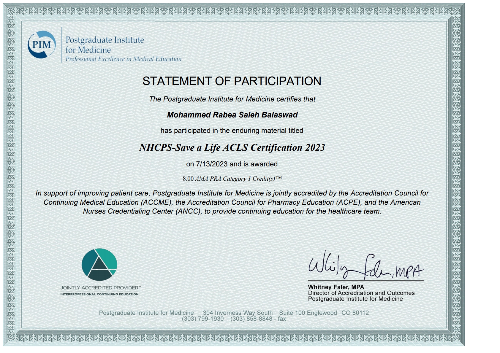 تم بحمد الله إتمام متطلبات الدورة التدريبية لمقدّم دعم الحياة القلبي الوعائي المتقدم ACLS واجتياز الامتحانالكتابي بنجاح والحصول على الشهادة المعتمدة، وكذا بطاقة إكمال دورة ACLS من منصة مقدمي الرعايةالصحية الوطنية العالمية National Health Care Provider Solutions (NHCPS) صالحة لمدة سنتين. وكذا توثيق الشهادة واعتمادها بمعدل ثمان ساعات أكاديمية معتمدة من معهد الدراسات العليا للطب Postgraduate Institute for Medicine.