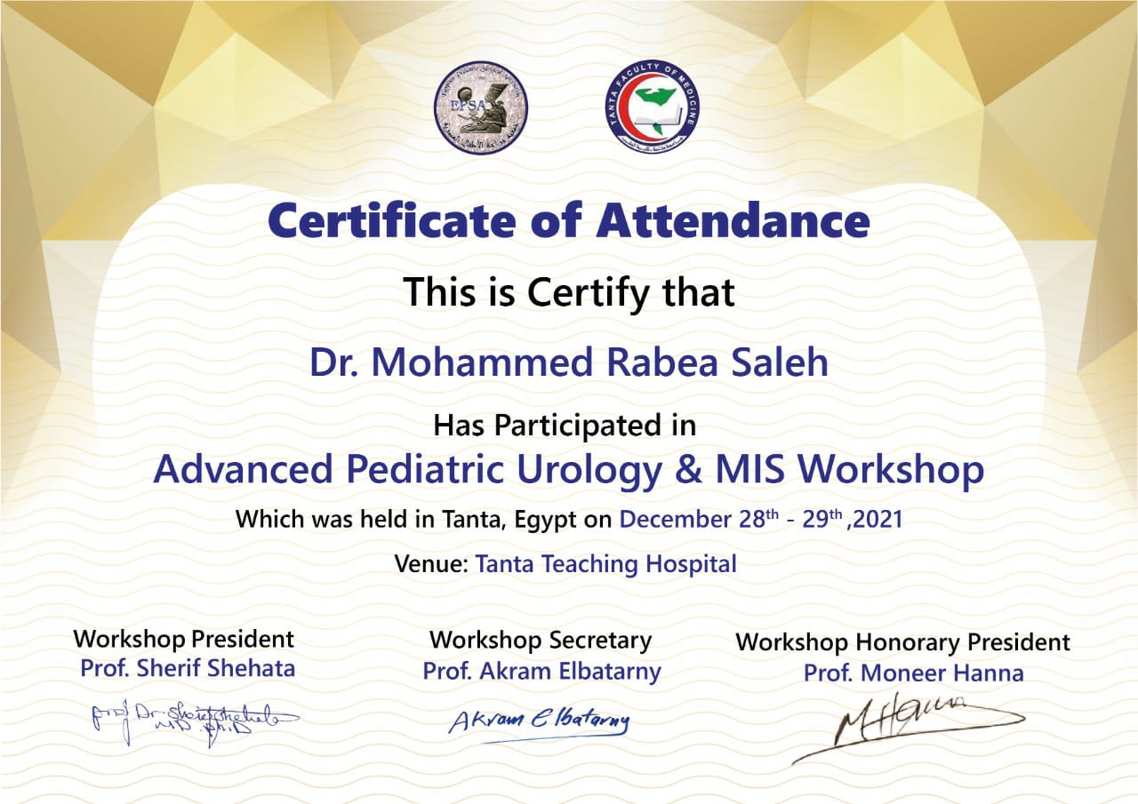 المشاركة في ورشة عمل متقدمة بجامعة طنطا قسم جراحة الأطفال، وموضوعها حول جراحات المسالك البولية للأطفال واصلاح عيوب المسالك البولية في الأطفال بحضور اساتذة مختصين في هذا المجال من داخل وخارج مصر..