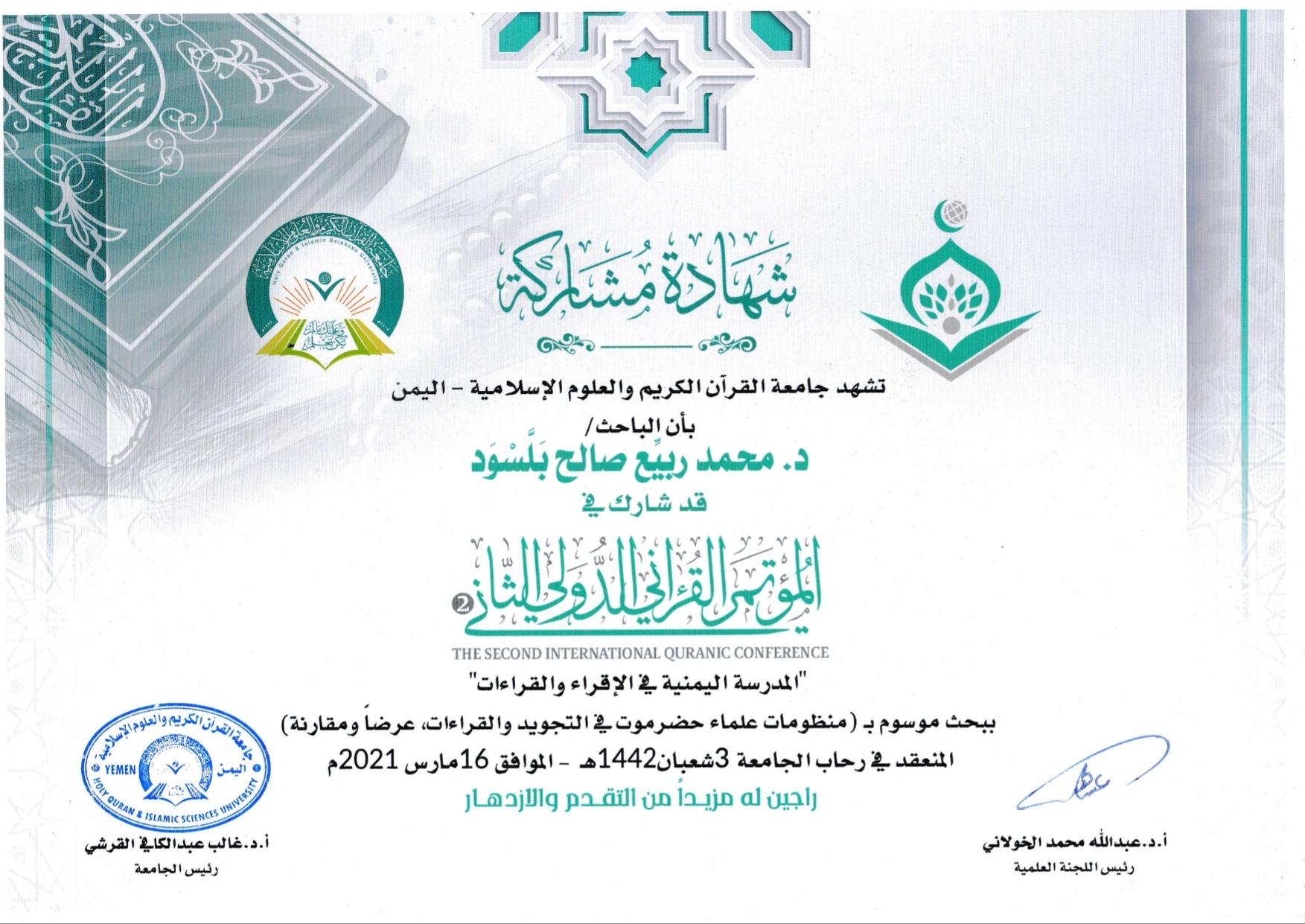 شاركتُ بفضل الله في مؤتمر القرآن الدولي الثاني بجامعة القرآن الكريم -اليمن- ببحث علمي عنوانه منظومات علماء حضرموت في التجويد والقراءات، عرضا ومقارنة، وتم نشره بفضل الله في مجلة الجامعة المحكمة...