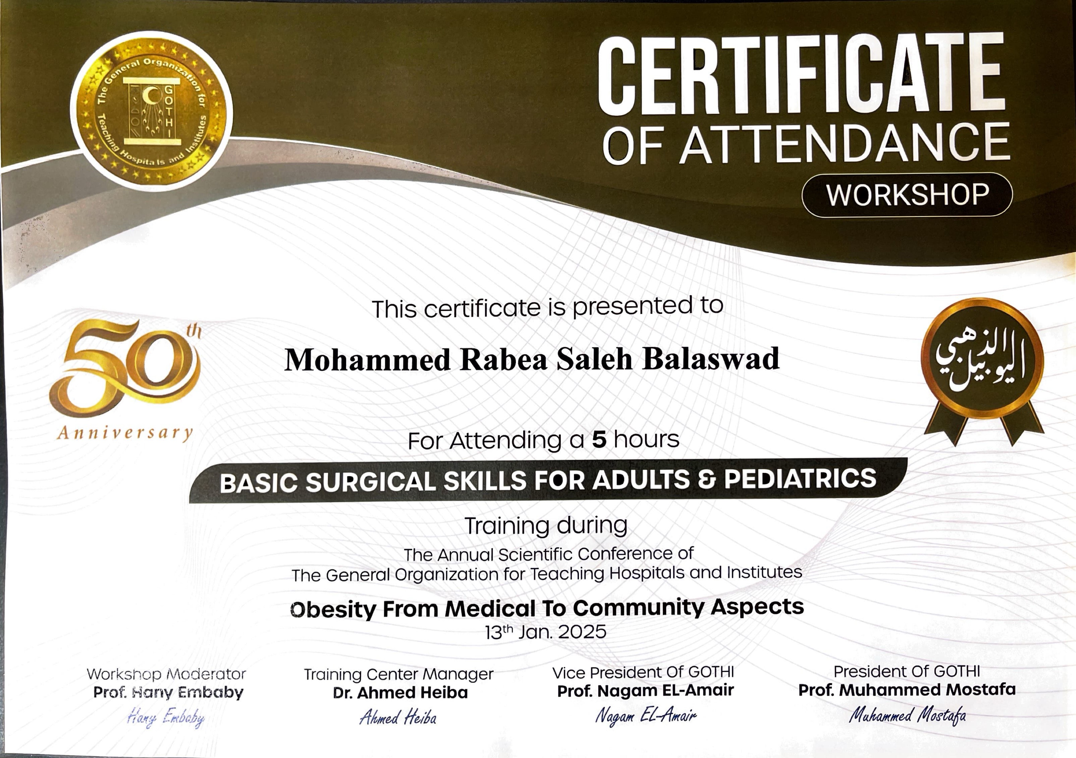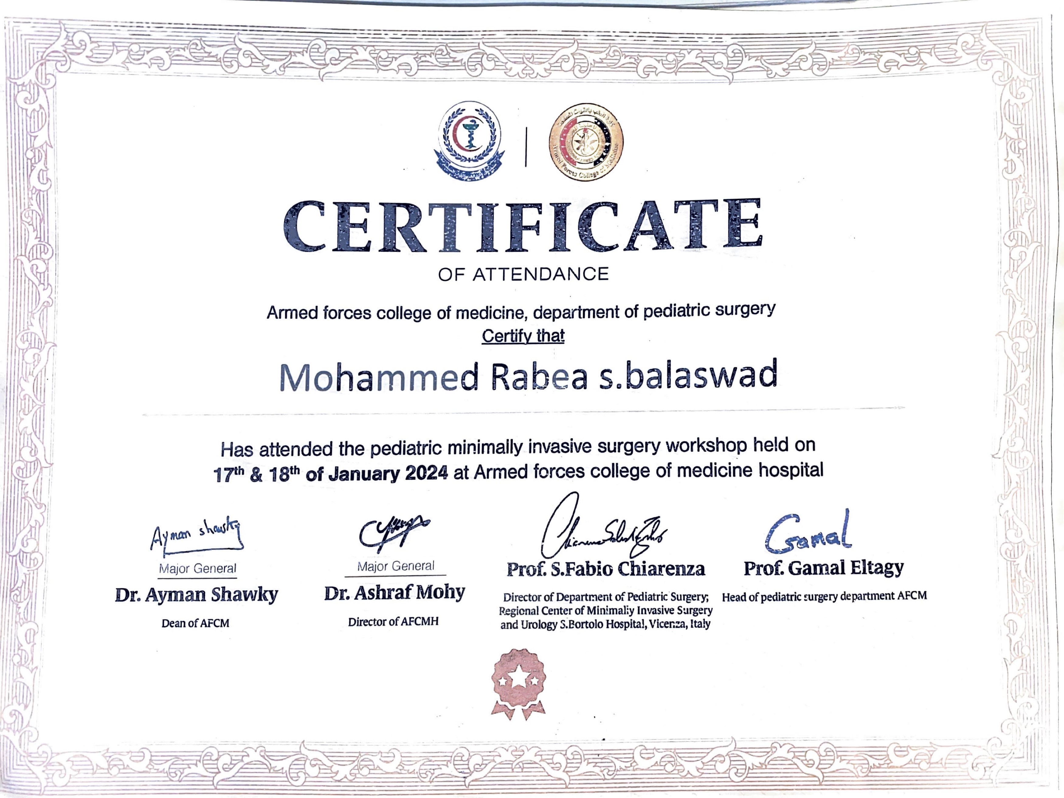 شهادة معتمدة بعد حضور ورشة عمل متقدمة في جراحة الأطفال