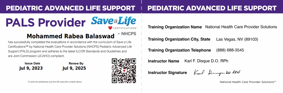 تابع إنجاز ١٢، شهادة اجتياز دورة دعم الحياة المتقدم للأطفال PALS