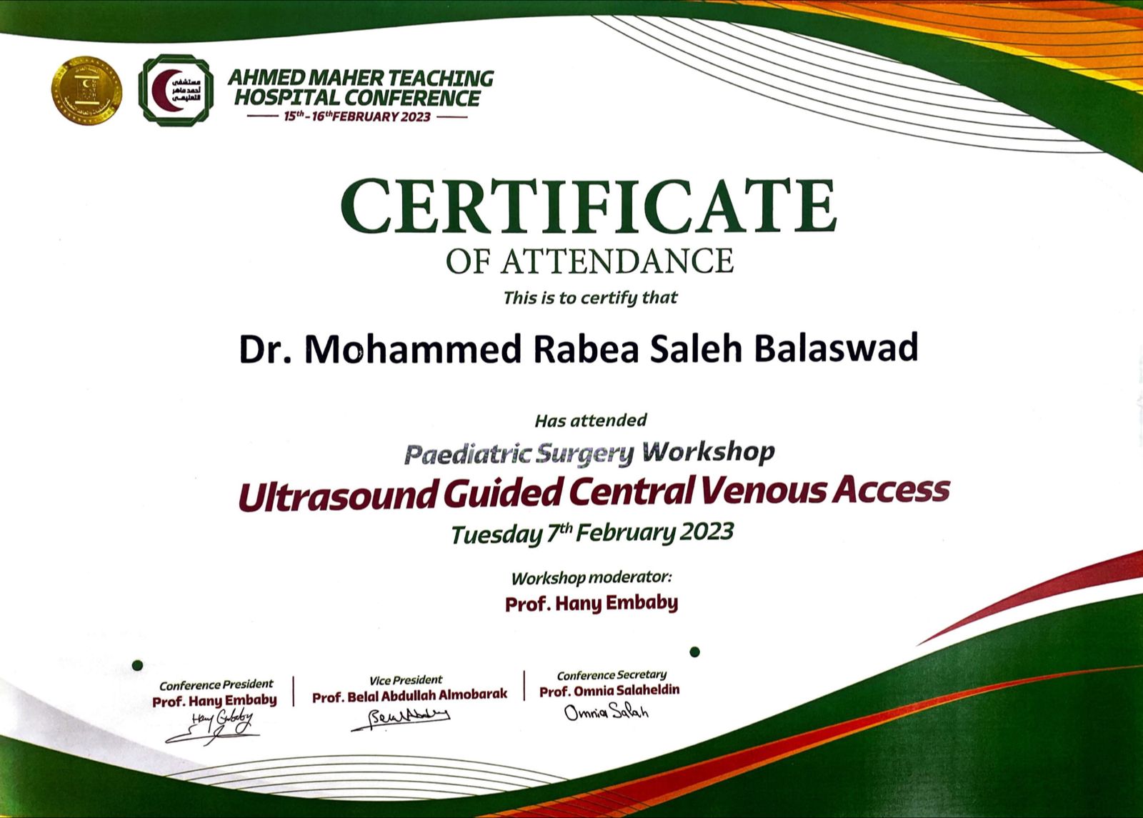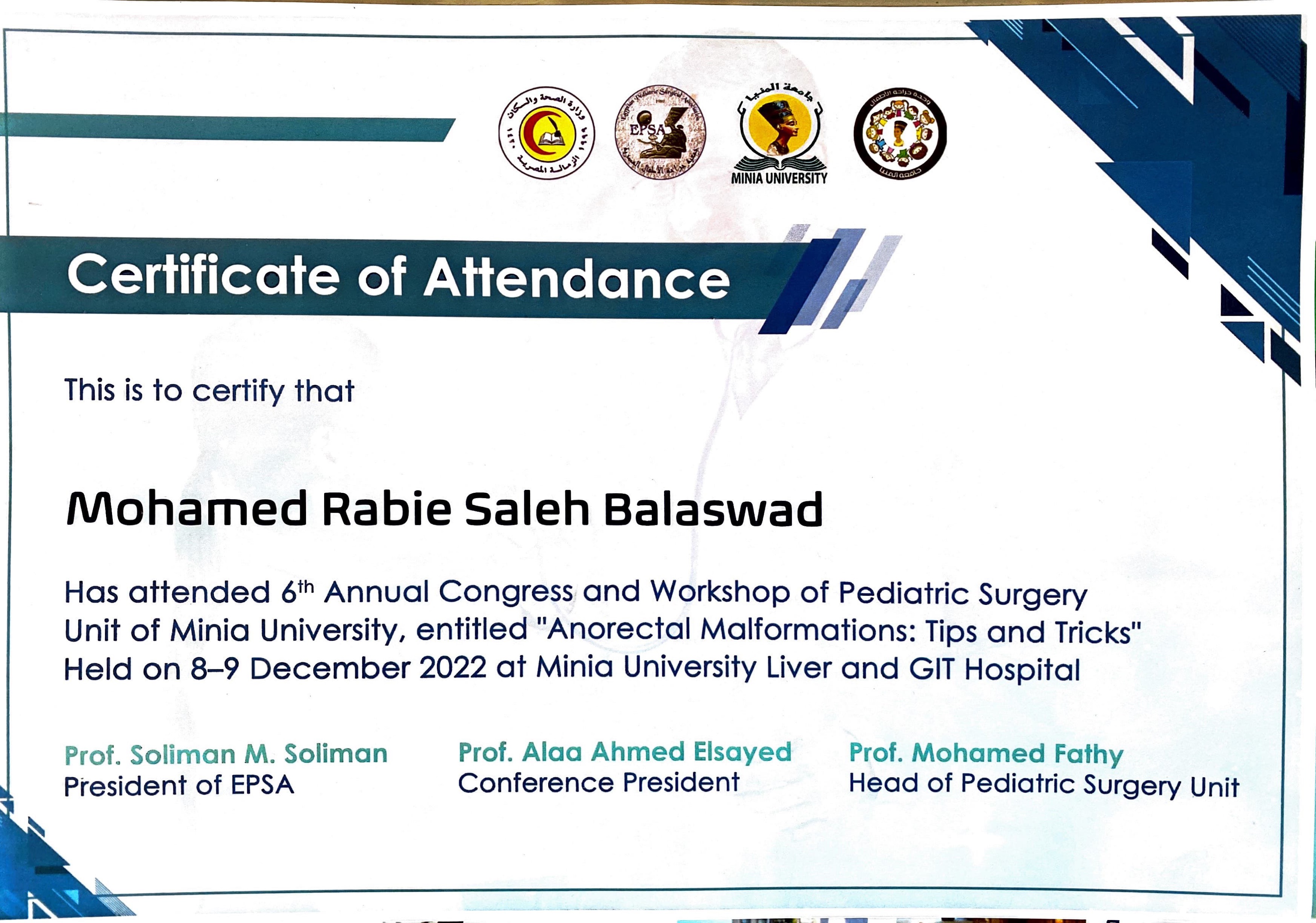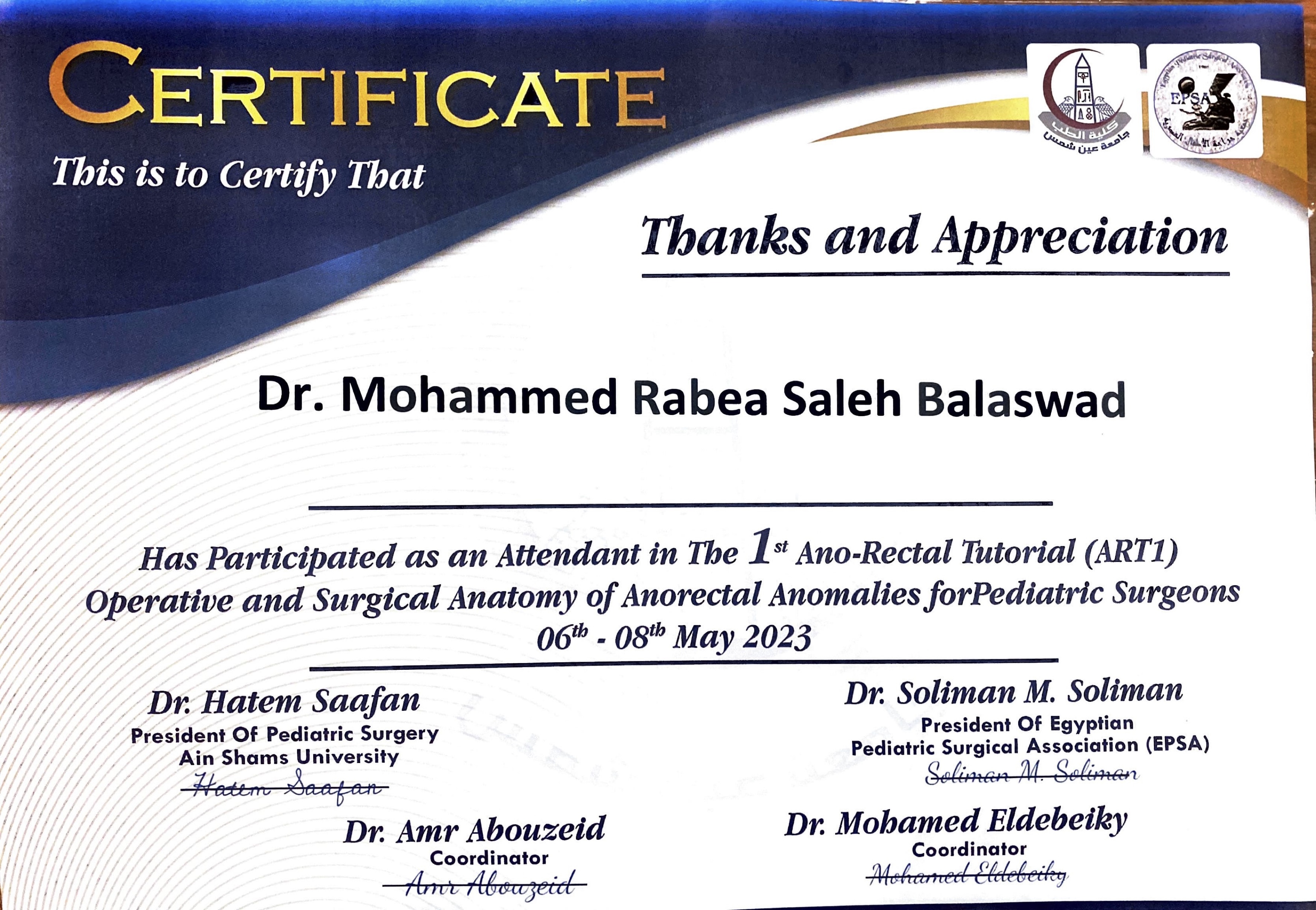 حضور دورة متقدمة في جراحات عيوب الشرج الخلقية في الأطفال بجامعة عين شمس