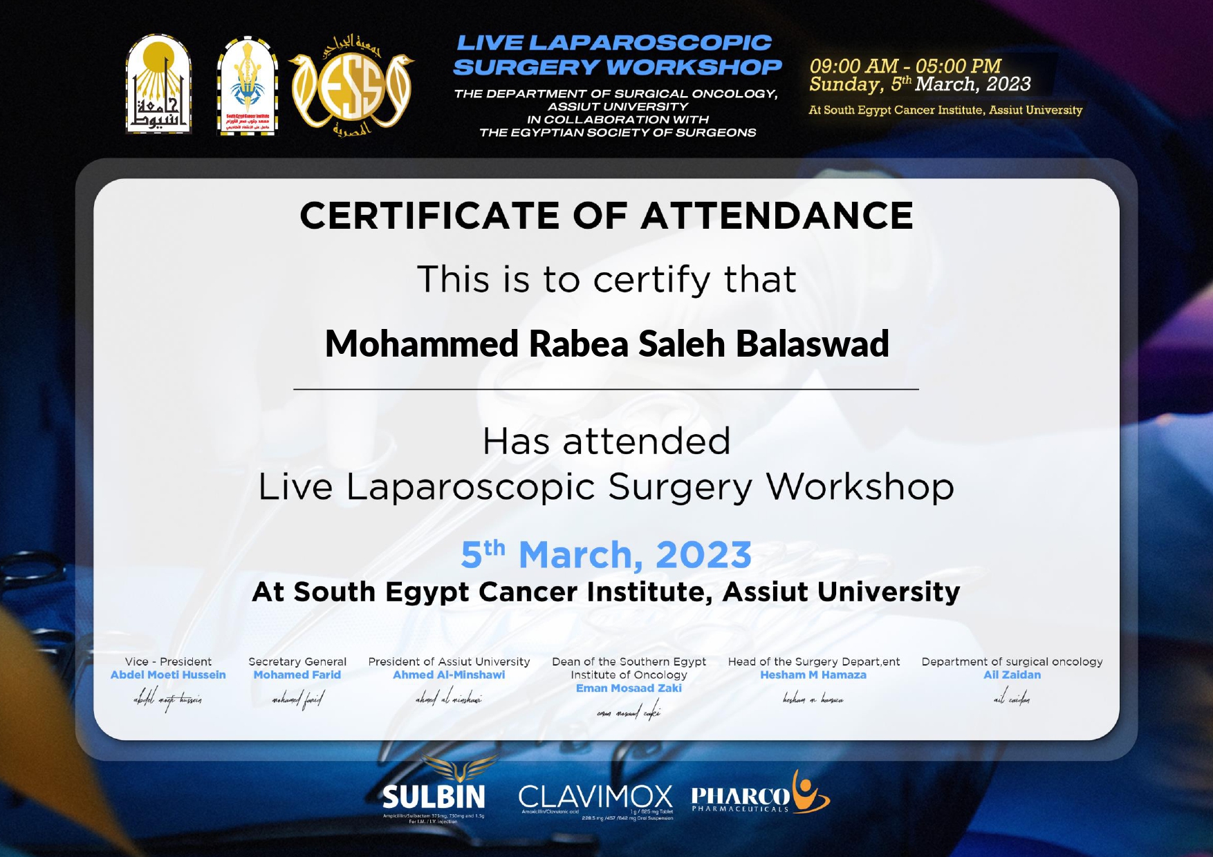 حضور ورشة عمل حول جراحات الأورام بالمنظار الجراحي بحامعة أسيوط