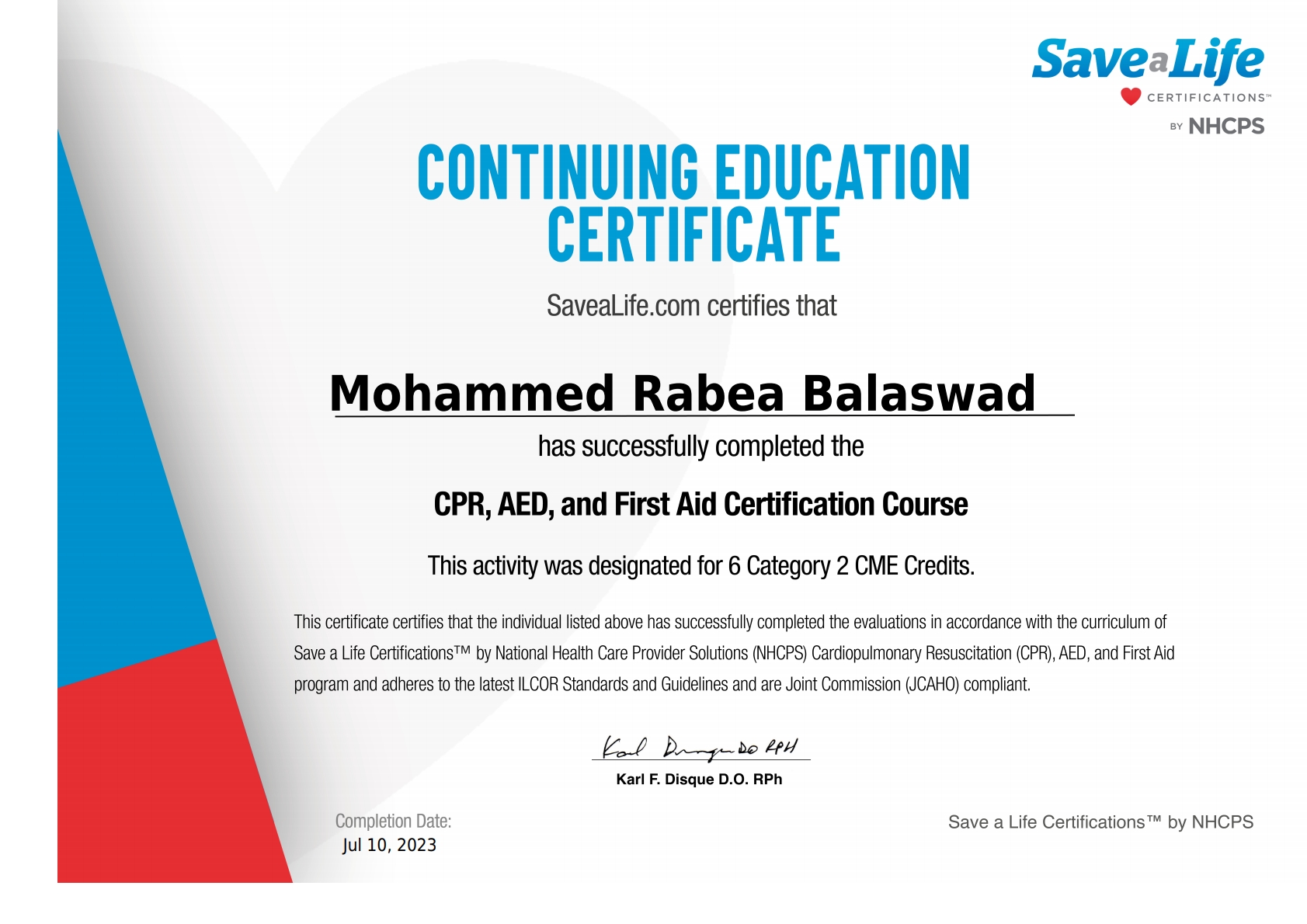 إتمام الدورة التدريبية لمقدّم دعم الحياة الأساسي BLS
